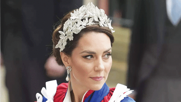 Catherine, whose formal title is Princess of Wales, instead wore a silver Jess Collett x Alexander McQueen headpiece with three-dimensional leaf embroidery, Buckingham Palace said.