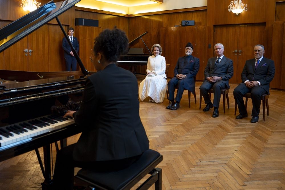 Then, His Majesty listened to a number of musical pieces that were played. After that, a private luncheon was held at the Queen Elisabeth Music Chapel in honour of His Majesty the Sultan and the accompanying delegation, in the presence of the King and Queen of the Belgians. After that, His Majesty the Sultan presented a musical instrument as a gift for the centre.