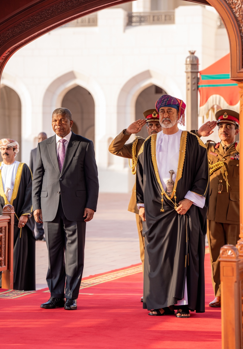 Upon the arrival of the motorcade of the President at the courtyard of the palace, His Majesty Sultan Haitham bin Tarik received the Angolan President, welcoming him as a dear guest in the Sultanate of Oman. His Majesty wished him and his accompanying delegation a successful visit.