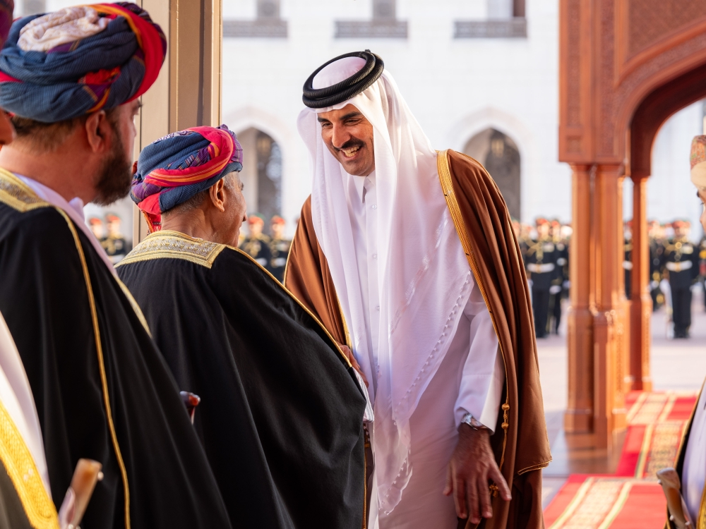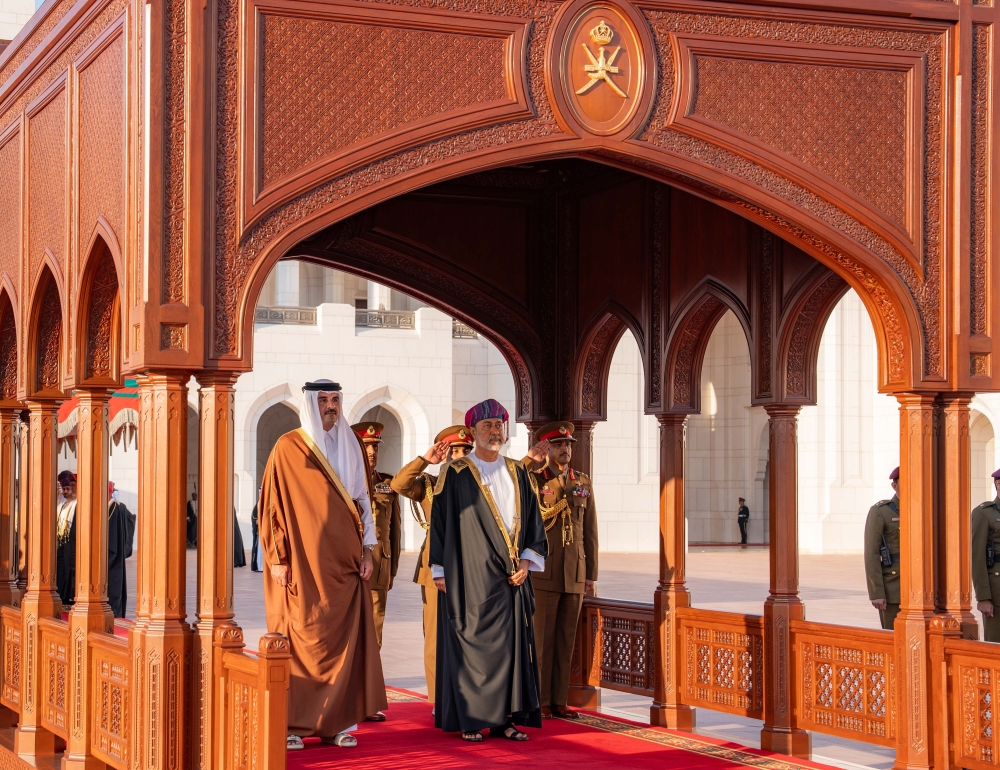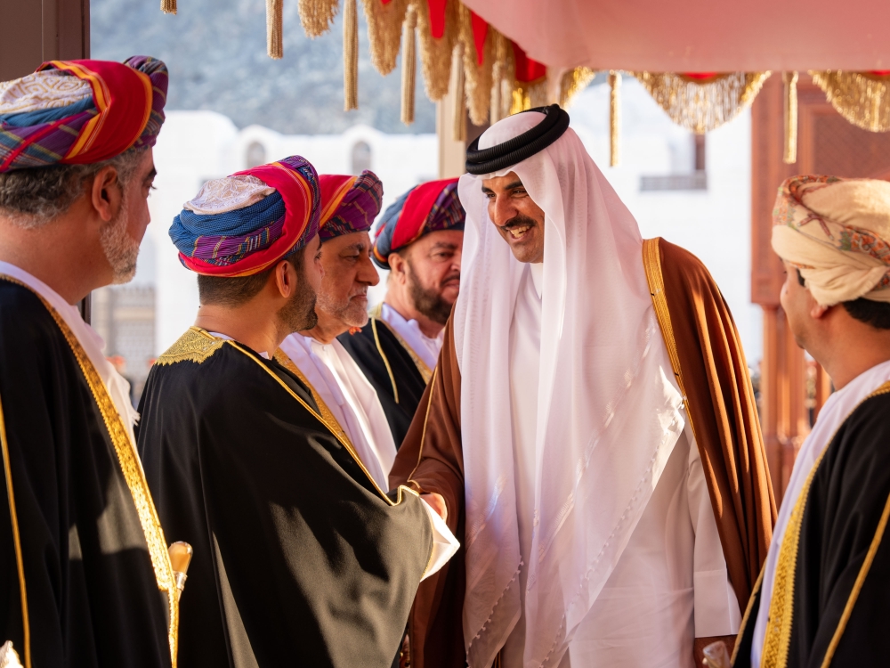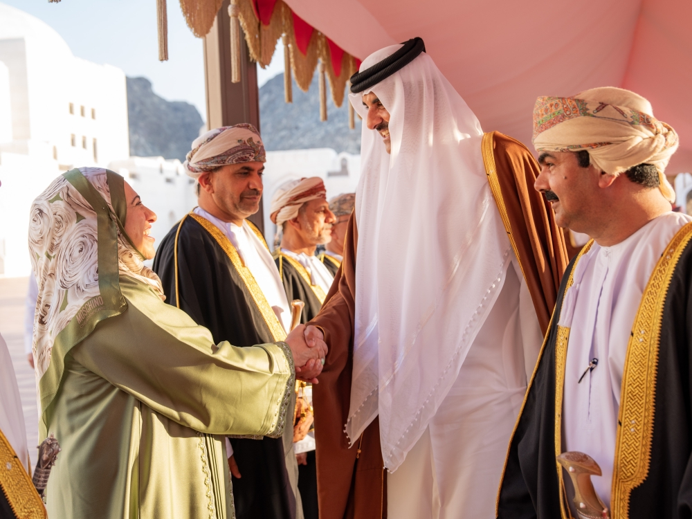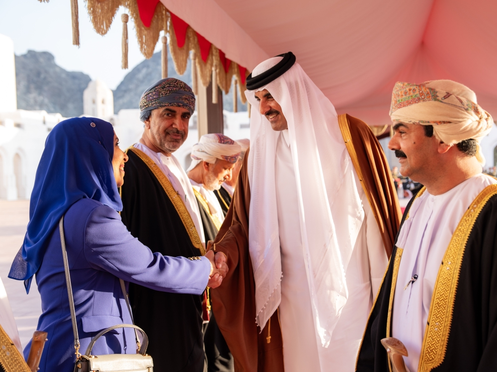 The Emir of Qatar is accompanied during the visit by an official delegation comprising Shaikh Saud bin Abdulrahman al Thani, Deputy Prime Minister and Minister of State for Defence Affairs, Shaikh Joaan bin Hamad al Thani, President of Qatar Olympic Committee, Abdullah bin Mohammed al Khulaifi, Chief of the Amiri Diwan, Ali bin Ahmed al Kuwari, Minister of Finance and Head of the Omani-Qatari Joint Committee, Shaikh Abdulrahman bin Hamad al Thani, Minister of Culture, Shaikh Hamad bin Khalifa al Thani, Minister of Sports and Youth, Shaikh Faisal bin Thani al Thani, Minister of Commerce and Industry, Dr Mohammed bin Abdulaziz al Khulaifi, Minister of State at the Ministry of Foreign Affairs, Saad bin Nasser al Kaabi, Director of the Department of Studies and Research at the Amiri Diwan, Mohammed Saif al Sowaidi, Chief Executive Officer of Qatar Investment Authority, Shaikh Mubarak bin Fahad al Thani, Ambassador of Qatar to Oman and Ambassador Abdulla bin Saif al Mansouri, Director of the GCC Affairs Department at the Ministry of Foreign Affairs.