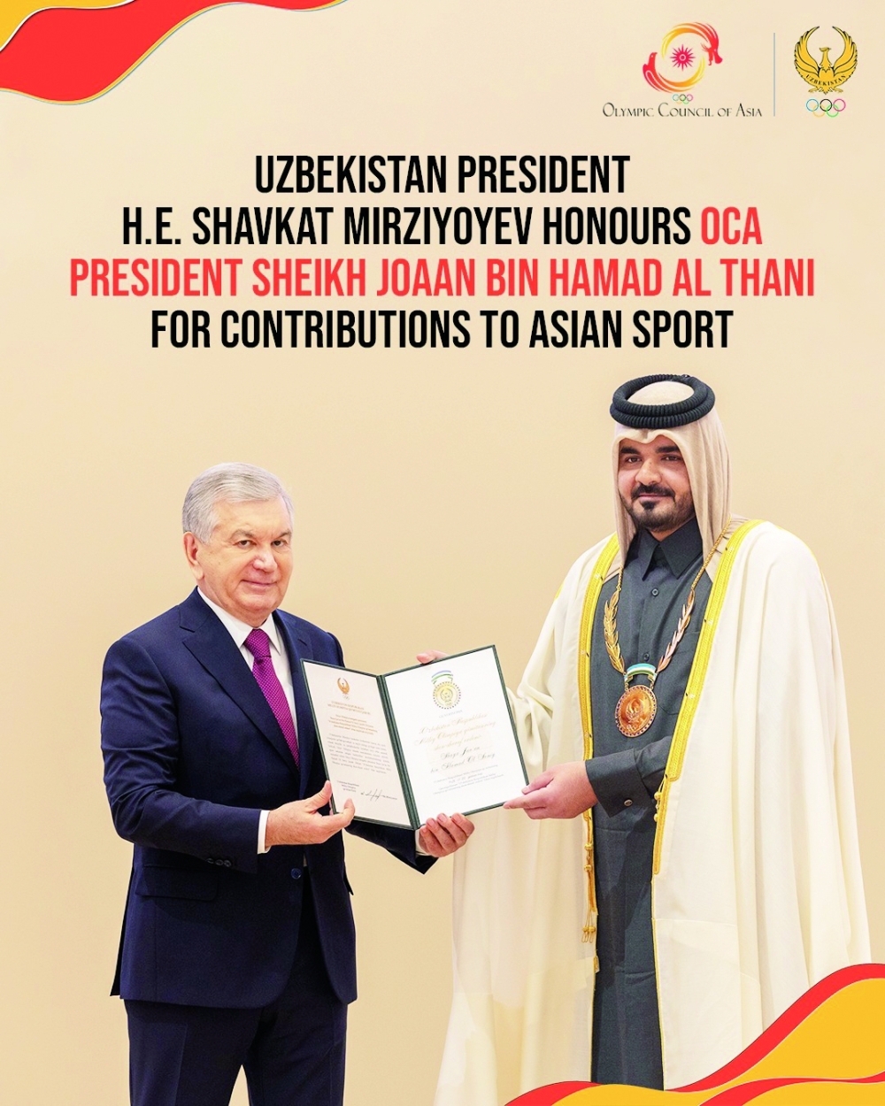The assembly witnessed the election of Shaikh Joaan bin Hamad al Thani as President of the Olympic Council of Asia, becoming the 22nd president of the Olympic movement in the continent since the first multi-sport Asian Games were held in 1913. The election was attended by all representatives of the Asian National Olympic Committees and included the presence of Shavkat Mirziyoyev, President of the Republic of Uzbekistan.