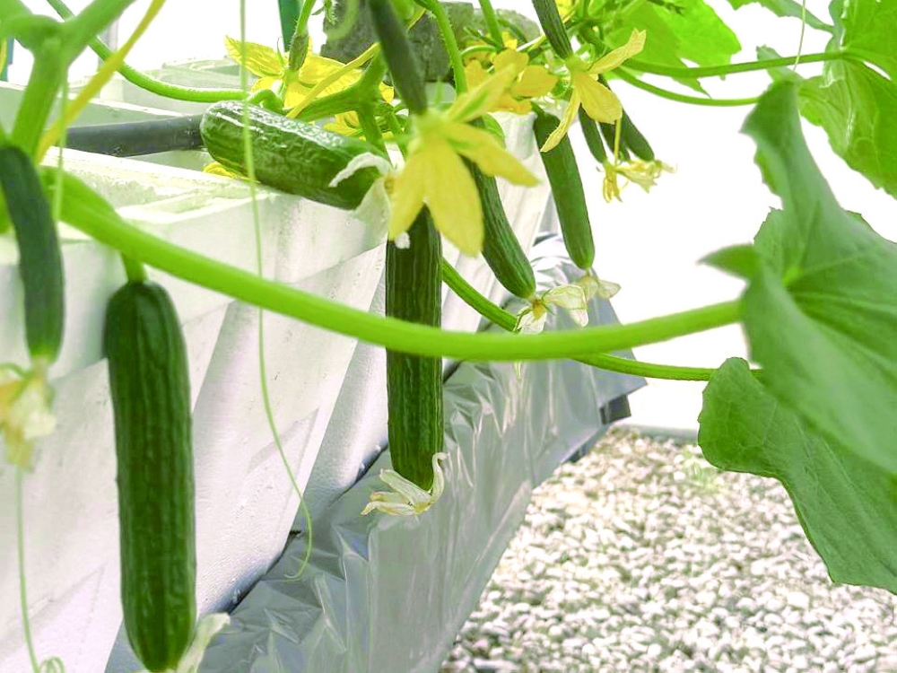 A fully integrated hydroponic system was set up, including a pyramid-shaped growing structure and two polystyrene pipes. Crops grown under the system include lettuce, cucumbers, tomatoes, bell peppers and zucchini.