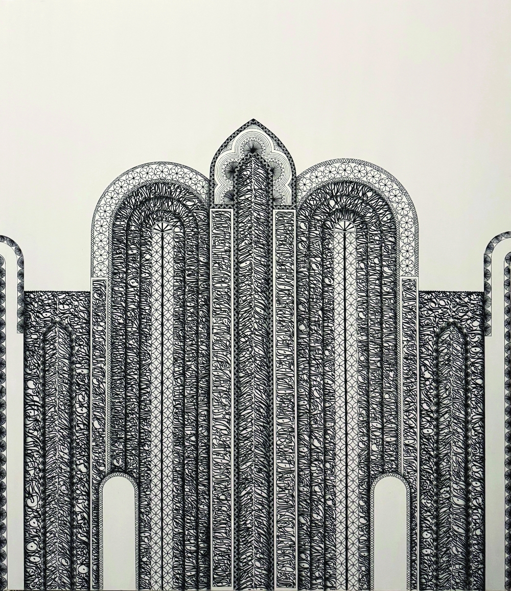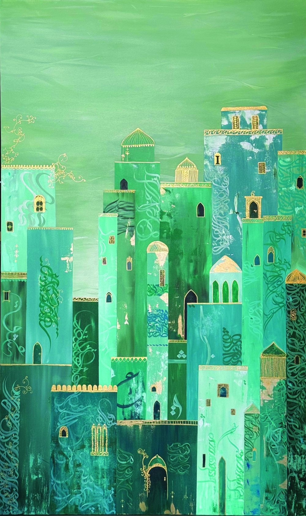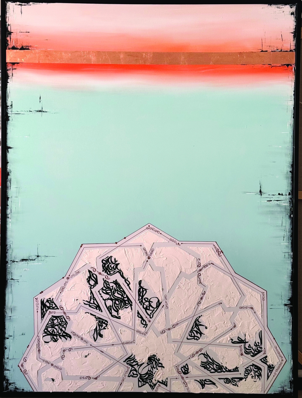 Her compositions unfold through layered interactions between script, geometry and organic ornament. The calligraphic forms flow across the canvas, often dissolving into intricate geometric structures reminiscent of architectural patterns found across the Middle East.