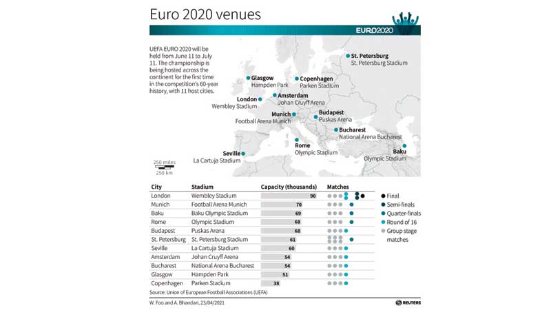 The first pan-European tournament runs from June 11 to July 11 having been postponed last year due to the Covid-19 pandemic.