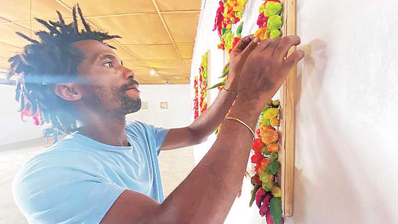 His pieces, comprising of red, yellow and green peppers mounted on boards and tomatoes hanging from nets, will rot during the lifespan of the exhibition in Lagos. The decay reflects the food wasted during lockdowns last year, said the 30-year-old artist.